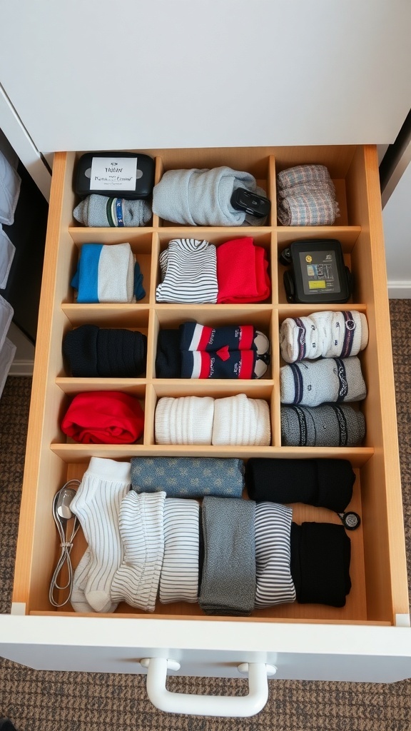 Drawer dividers are a simple yet effective way to organize small clothing items in your dorm closet. The image shows a neatly arranged drawer filled with socks, undergarments, and other small essentials. Each item has its own space, making it easy to find what you need without digging through a messy pile.