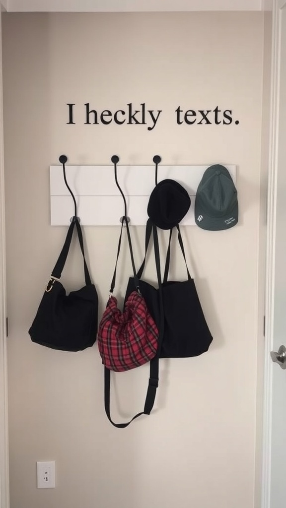 The image shows a neat setup with a wall-mounted hook rack. It features several hooks that hold various bags and hats. This not only saves space but also makes it easy to grab what you need when you’re in a hurry.