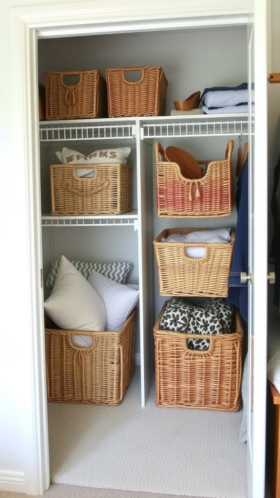 Baskets are perfect for storing miscellaneous items like extra pillows, blankets, or even shoes. They help keep your closet tidy and can add a touch of style. You can choose different sizes and colors to match your room’s decor.