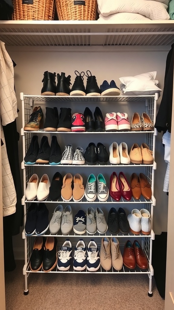 Using a simple wire rack like the one in the image is a great idea. It’s lightweight, easy to assemble, and fits well in most closets. Plus, it allows for airflow, which helps keep your shoes fresh. Consider adding baskets above the rack for storing accessories or other small items to maximize your closet space.