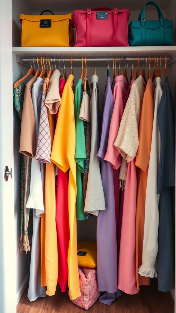 In the picture, you can see a variety of colorful garments hanging on wooden hangers. From vibrant yellows and greens to soft pastels, each piece stands out. The bags on top add a fun touch and show that you can incorporate accessories into your organization system too.