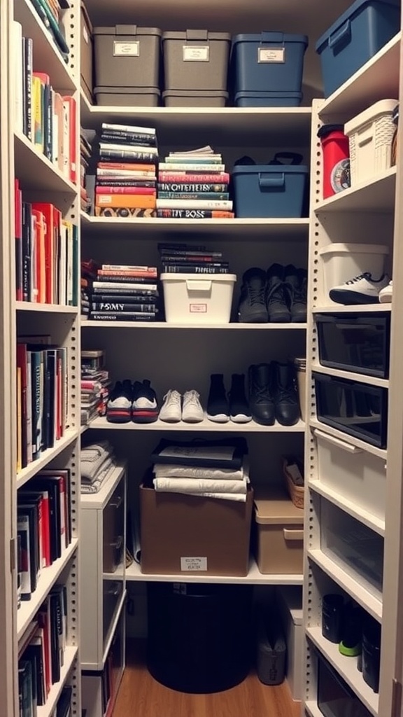 Using clear storage bins is another smart idea. They keep everything visible and accessible while maximizing your vertical space. You can easily see what’s inside without having to dig through piles of stuff.
