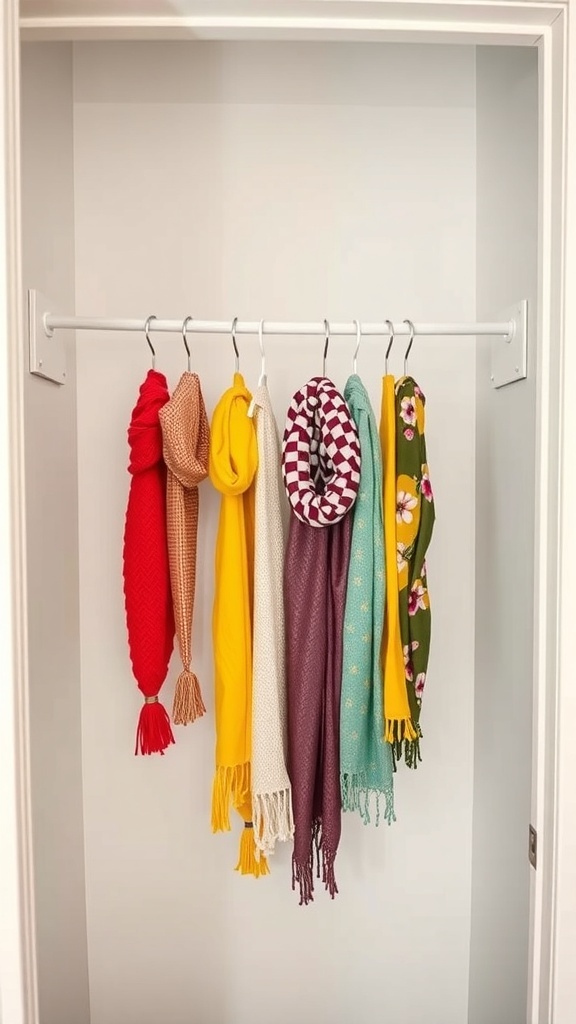 Simply hang your scarves on the rod using clips or hooks. This method keeps them wrinkle-free and easily accessible. Plus, it adds a pop of color to your closet, making it more inviting.
