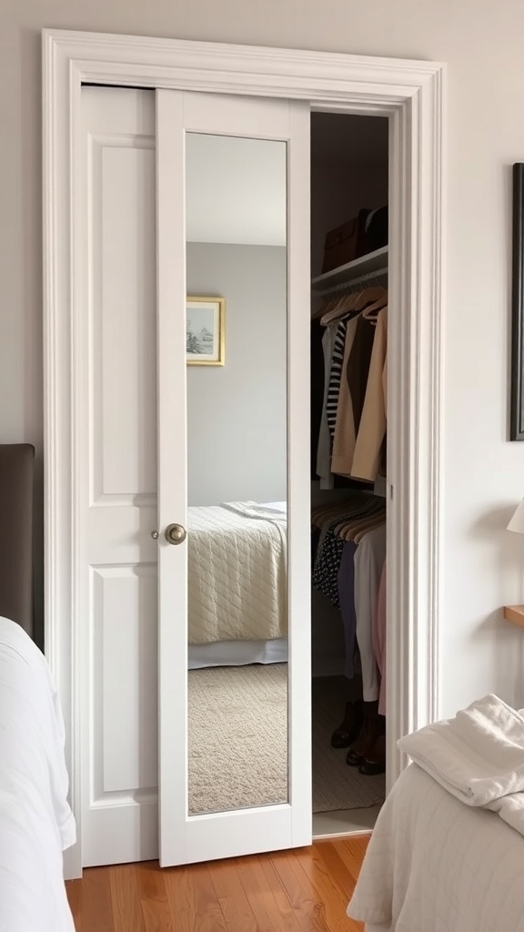 A full-length mirror can be a fantastic addition to your dorm closet. It not only serves a practical purpose but also enhances the overall look of your space. In the image, you can see a stylish closet door with a sleek mirror. This setup allows for quick outfit checks before heading out, making your morning routine smoother.