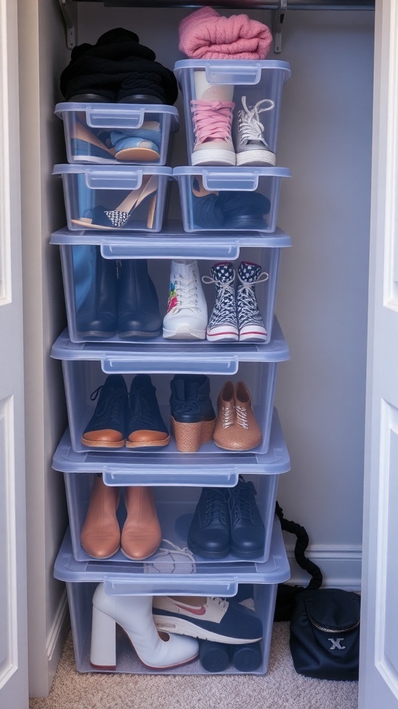 Clear storage bins are a fantastic way to keep your dorm closet organized. They let you see exactly what you have without digging through piles of clothes or shoes. This image shows a well-arranged closet with several clear bins stacked neatly. Each bin holds different types of footwear, making it easy to grab what you need.