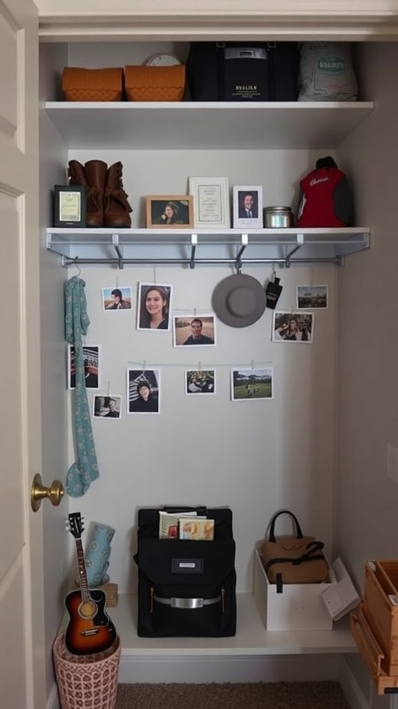 In the image, you can see a well-organized closet featuring a variety of personal touches. Pictures of friends and family hang on a wire, making the space feel warm and inviting. This simple addition can brighten your day and remind you of home.