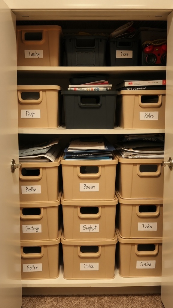 Keeping your dorm closet organized can feel like a challenge, but labeling storage boxes makes it so much easier. In the image, you can see a neatly arranged closet with labeled boxes. Each box has a clear label, allowing you to spot what you need at a glance.