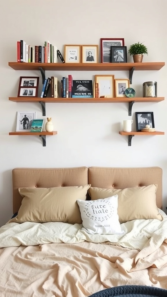 The image shows a cozy setup with floating shelves above a bed. The shelves are filled with books, framed photos, and decorative items, creating a personalized look. This arrangement not only serves as a headboard but also showcases your personality and interests.