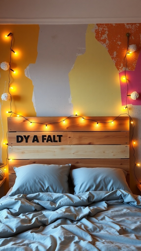 A DIY pallet headboard can bring a cozy and rustic vibe to your dorm room. The image shows a simple yet stylish headboard made from wooden pallets, giving it a unique charm. The warm glow of string lights adds a touch of warmth and personality, making the space feel inviting.