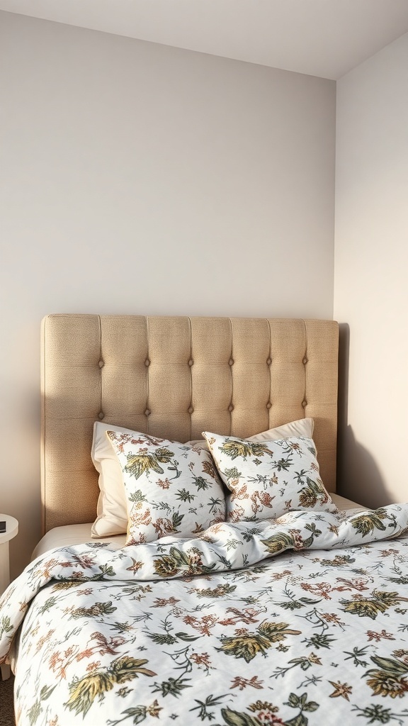 Choosing a fabric headboard can be a smart move for students. They come in various colors and patterns, allowing you to express your personal style. The floral bedding in the image complements the headboard nicely, creating a harmonious look. This combination makes your bed a focal point in the room, inviting you to relax and unwind.