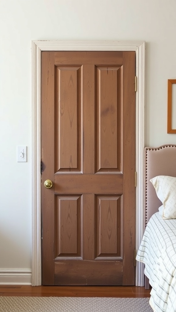 The door in the image showcases a classic design with a warm, wooden finish. It stands tall behind the bed, creating a unique focal point. This look can easily blend with various decor styles, from rustic to modern.