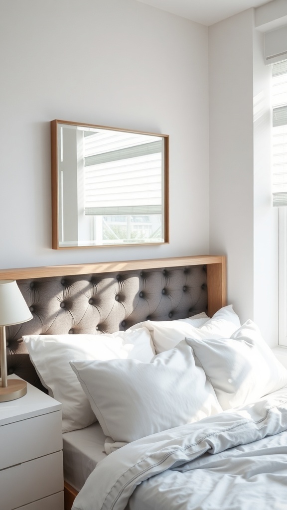 In the image, you see a stylish setup with a tufted headboard paired with a sleek mirror above it. This combination creates a cozy yet modern look. The soft pillows and bedding add comfort, while the mirror serves as a focal point that draws the eye.