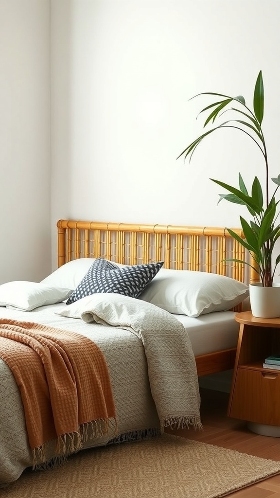 The image shows a beautifully arranged bed with a bamboo headboard. The headboard’s simple design complements the soft bedding and decorative pillows. The warm tones of the blankets and the plant beside the bed create a relaxing atmosphere.