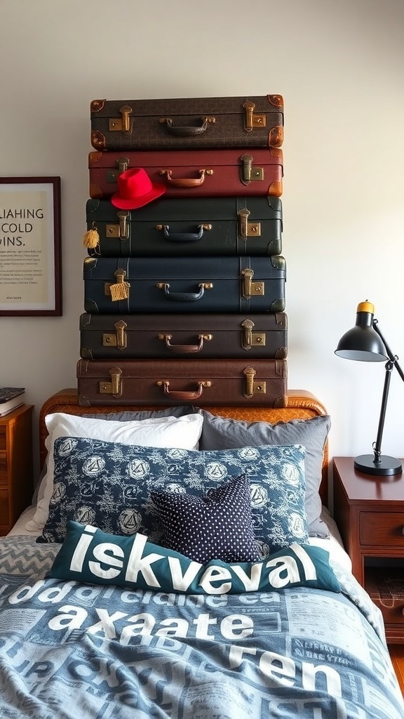 If you’re looking for a unique way to jazz up your dorm room, a vintage suitcase headboard is a fun option. This creative idea uses stacked suitcases to create a headboard that stands out. Each suitcase brings its own character, adding a touch of nostalgia and charm to your space.