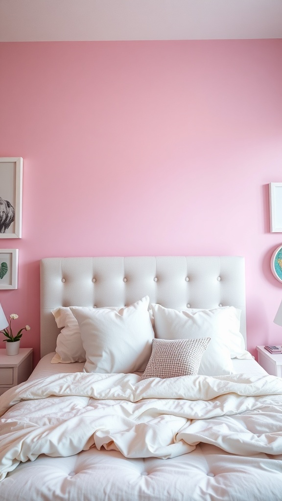 Fabric panels are a stylish and cozy option for a dorm headboard. They add a soft touch to your space, making it feel more inviting. The image shows a lovely fabric headboard in a light color, which complements the pink wall behind it.