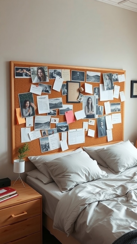 A corkboard headboard is a fun and functional way to personalize your dorm room. It serves as a creative canvas where you can pin up photos, notes, and reminders. The image shows a cozy bed with a corkboard headboard filled with various pictures and papers. This setup not only adds color to the room but also keeps your important items within reach.