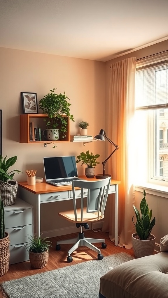 The natural light streaming in from the window adds a cheerful vibe. Plants on the desk and nearby bring a touch of nature indoors, which can help reduce stress. A comfortable chair invites you to sit down and get to work.