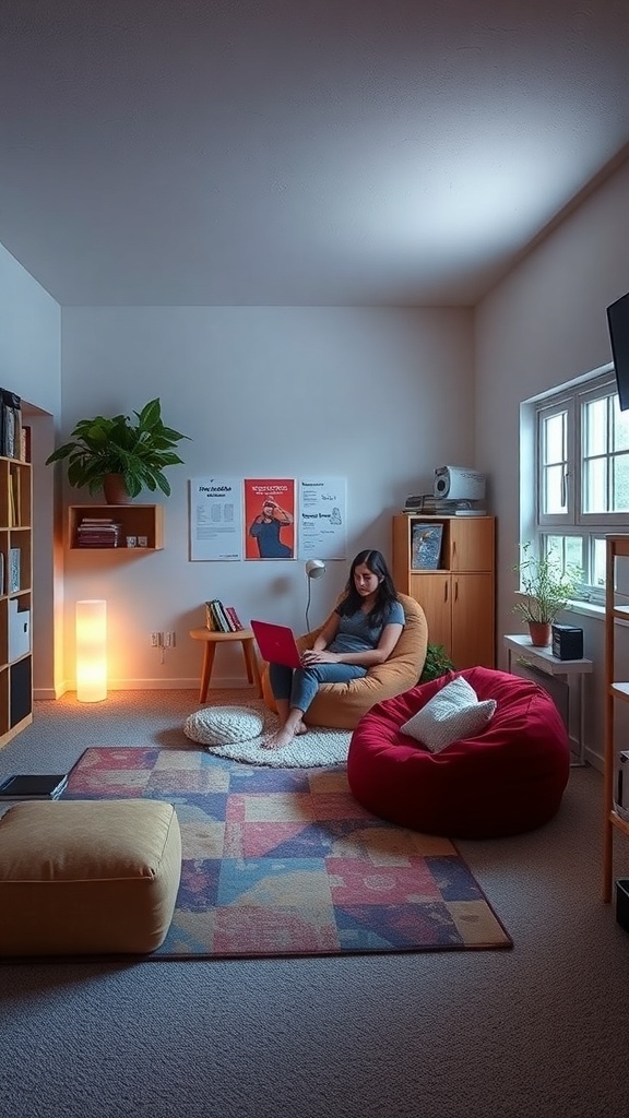 Creating a cozy lounge area in your dorm can make a big difference in how you unwind after a long day. The image shows a bright, inviting space with comfortable seating options like bean bags and a soft rug. This setup encourages relaxation and socializing, perfect for hanging out with friends or enjoying some quiet time.