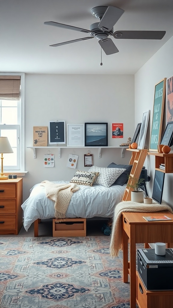 When it comes to dorm layouts, making the most of vertical space is key. The image shows a well-organized shelving unit that combines style and functionality. This setup not only saves floor space but also adds character to the room.