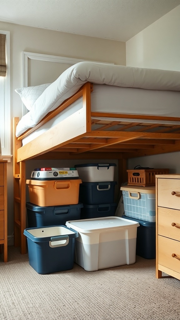 Under the bed, you can see various storage bins in different colors and sizes. These bins are ideal for stashing away clothes, books, or even extra bedding. Choosing clear bins can make it easy to see what’s inside, while colorful ones can add a pop of personality to your room.