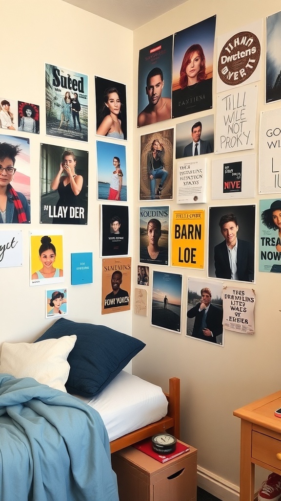 Wall art is a fantastic way to express your personality in your dorm room. The image shows a vibrant collection of posters and photos that cover a wall, creating a lively atmosphere. Each piece tells a story, reflecting the interests and tastes of the person living there.