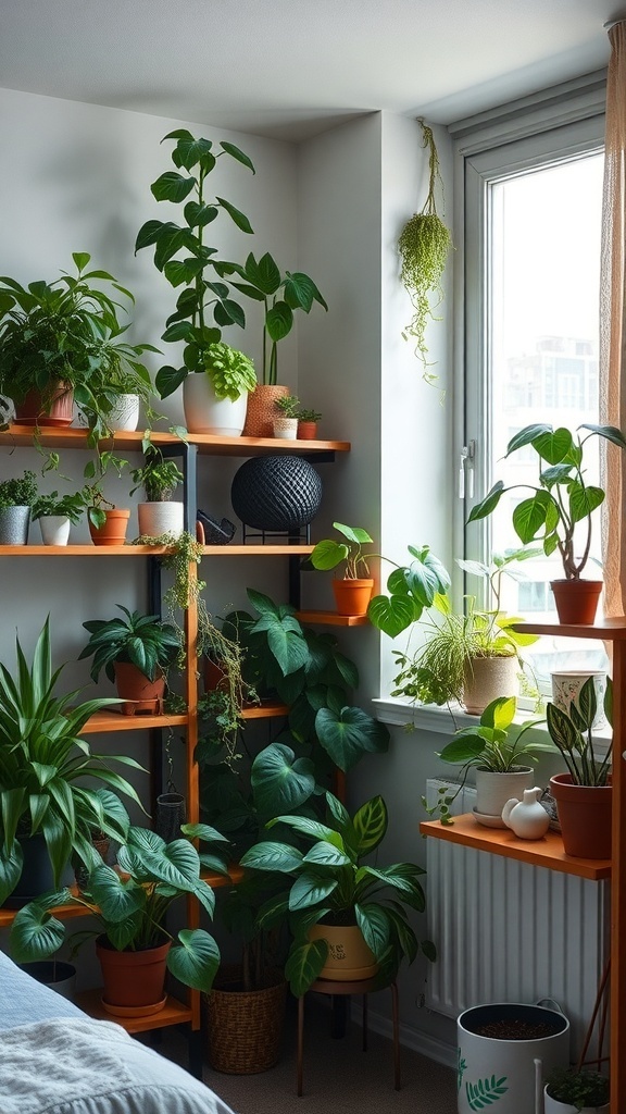 Bringing plants into your dorm can completely change the vibe of your space. The image shows a cozy corner filled with various green plants, creating a lively and inviting atmosphere. The shelves are lined with pots of different sizes, showcasing a mix of leafy greens that add a touch of nature indoors.