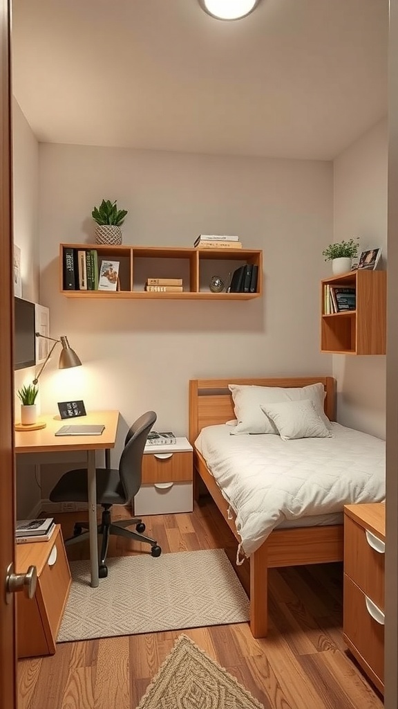 Adding plants brings a touch of life to the room, making it feel more inviting. Overall, this layout is a great example of how to use multi-functional furniture to maximize small spaces in a dorm.