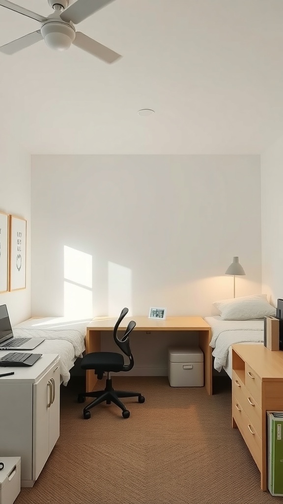 Creating a minimalist dorm room can be a fun and rewarding experience. The image shows a clean and simple layout that embodies this style perfectly. With two beds, a shared workspace, and plenty of natural light, it sets a calm and organized tone.