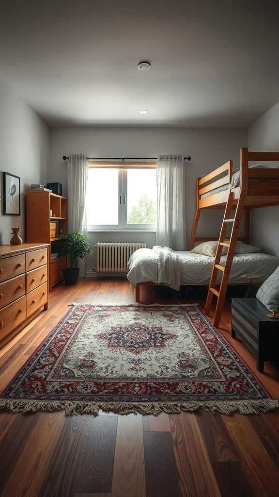 Rugs can work wonders in a dorm room, especially when it comes to defining different areas. In the image, a beautiful rug sits prominently on the wooden floor, creating a cozy vibe. This simple addition can make a big difference in how the space feels.