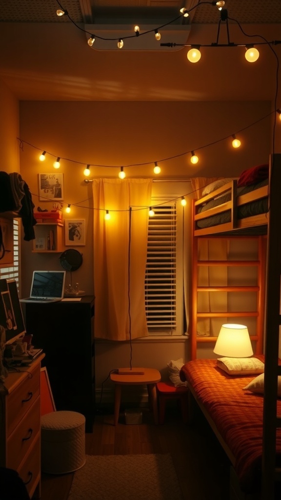 Creating a cozy atmosphere in your dorm is easy with the right lighting. The image shows a small room filled with warm, inviting light. String lights hang across the ceiling, casting a soft glow that instantly makes the space feel more welcoming.