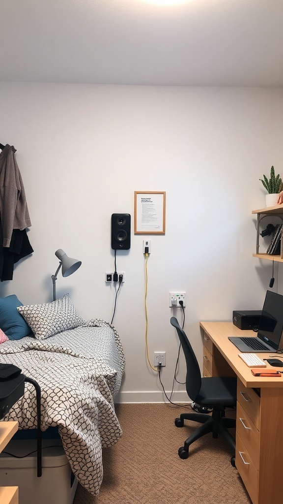 Creating a tech-friendly dorm room can make a big difference in your daily life. The image shows a cozy space with a bed and a desk, perfect for studying and relaxing. The setup is simple yet effective, allowing for easy access to technology.