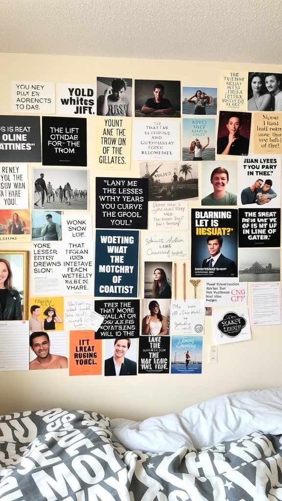 Your dorm room can be more than just a place to sleep; it can be a canvas for your creativity. A wall filled with inspiration is a great way to express yourself and motivate you daily. The image shows a vibrant collage of quotes, photos, and personal messages that can spark joy and reflection.