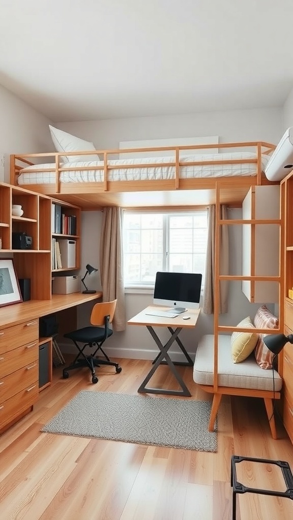 Overall, this room is a fantastic example of how to use functional furniture to create a stylish and practical living space. Lofted beds, desks, and smart storage solutions can transform any small area into a comfortable retreat.