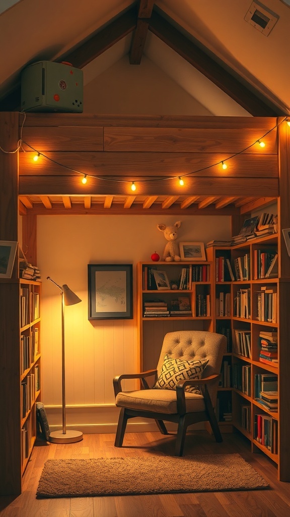 Surrounding the chair are shelves filled with books, showcasing a variety of genres. This setup not only provides easy access to your reading material but also adds a personal touch to your space. A small rug underfoot adds comfort, making it an ideal spot to curl up and get lost in a story.