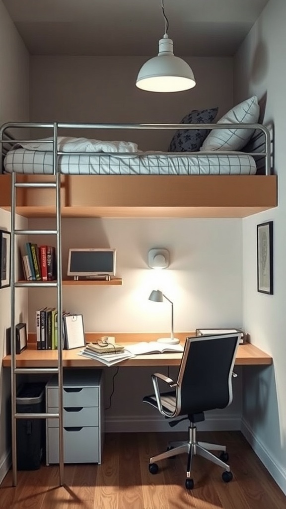 The image shows a well-organized study nook with a clean desk, a comfortable chair, and good lighting. The desk is positioned perfectly under the loft, providing ample room for books and a laptop. A small lamp adds a warm glow, making it inviting for late-night study sessions.
