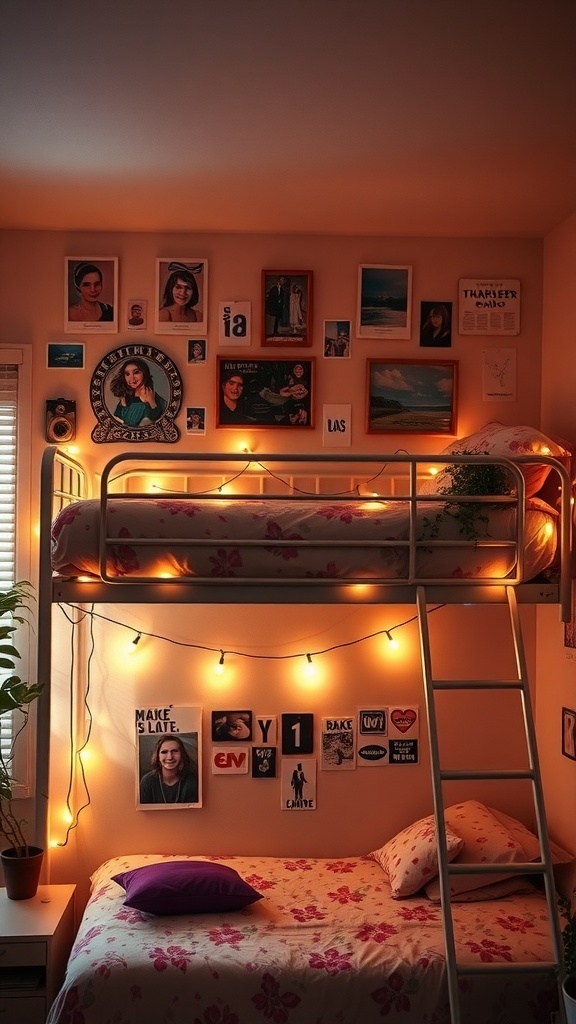 A gallery wall is a fantastic way to add personality to your dorm room. It can turn a plain wall into a vibrant display of memories and creativity. In the image, we see a lofted bed with a stunning gallery wall right above it. The wall is filled with framed photos, showcasing friends, family, and beautiful landscapes. This setup not only makes the room feel more inviting but also serves as a daily reminder of cherished moments.