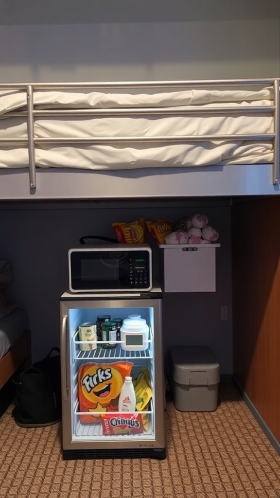 Having a mini fridge in your dorm room is a game changer. It keeps your favorite snacks and drinks close by, making late-night study sessions or movie marathons much more enjoyable. In the image, you can see a compact fridge that fits perfectly under a lofted bed, maximizing space while providing easy access to snacks.