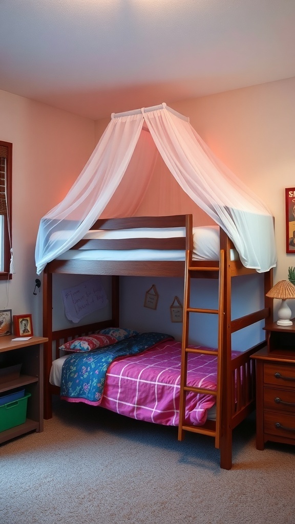 Don’t forget to add some fairy lights or soft lighting inside the canopy for a magical touch. This will create a warm glow, making your lofted bed the perfect spot to unwind after a long day.