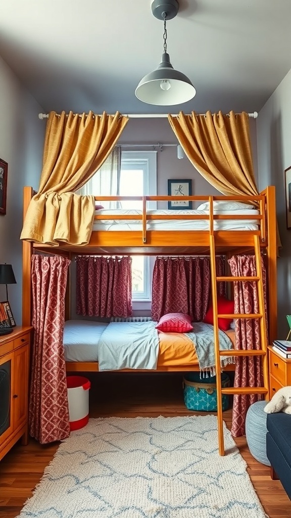 The image showcases a lofted bed draped with warm, inviting curtains. The golden tones of the curtains add a splash of color and warmth to the room. They not only block out light but also provide a sense of separation from the rest of the space.