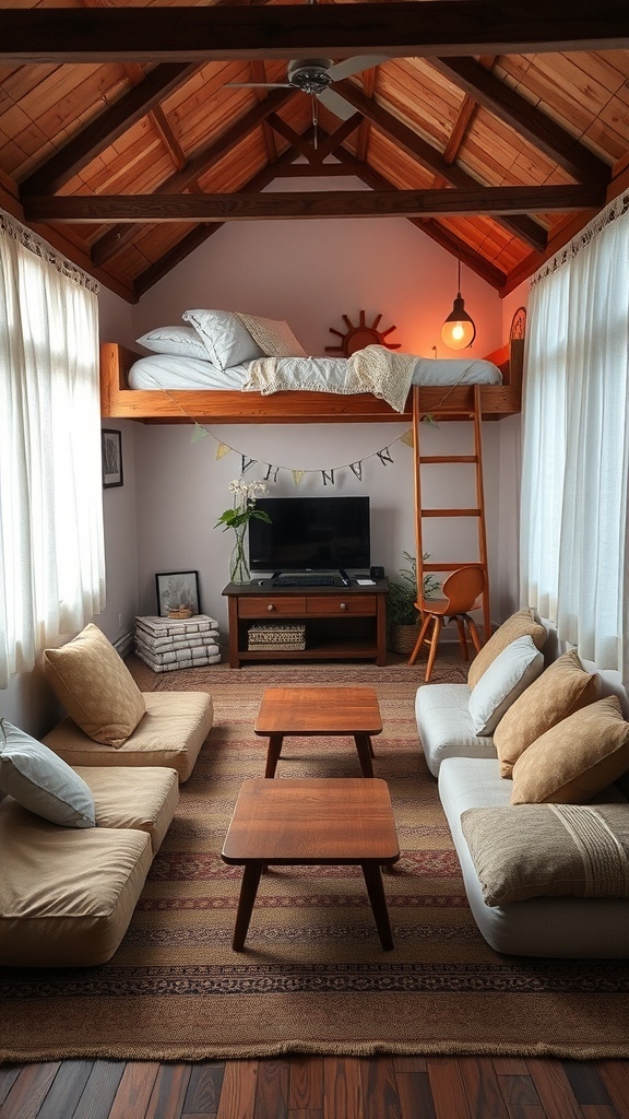 The lofted bed above adds space and a unique vibe to the room. Below, the floor cushions provide a comfortable area to unwind. Pairing them with low tables makes it easy to grab snacks or drinks while enjoying a movie or chatting with friends.