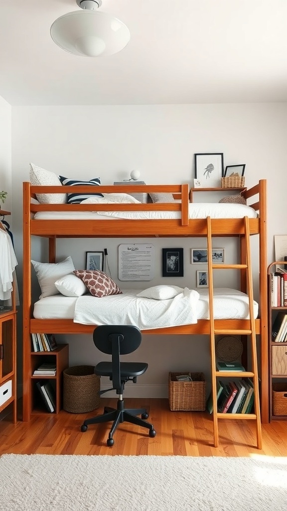 Underneath the lofted bed, you can see a cozy workspace with a chair and a few storage baskets. This area can easily be transformed into a study nook or a mini-library. Adding shelves above the desk can hold books, plants, or decorative items, making the space feel more personalized.