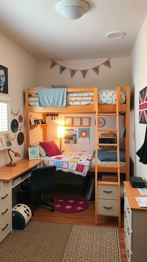 On the wall, you can spot various decorations, including framed pictures and a playful banner. These elements add character and reflect individual interests. The desk area is practical, providing a spot for studying while keeping the vibe relaxed.