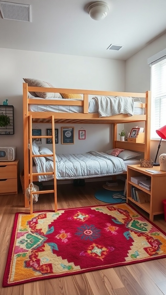 A colorful rug can really change the vibe of a dorm room. In the image, the vibrant rug adds warmth and personality to the space. It creates a cozy spot that invites you to sit down and relax.