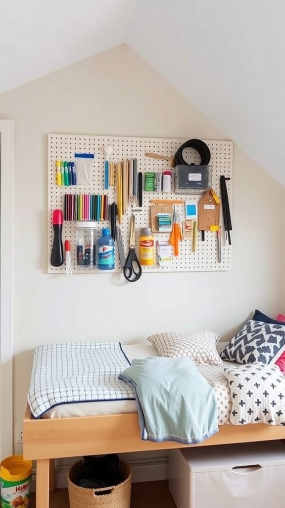 A pegboard is a fantastic addition to any dorm room, especially when space is limited. It offers a simple way to keep your essentials organized and easily accessible. In the image, you can see a well-arranged pegboard filled with various supplies like pens, scissors, and sticky notes. This setup not only looks neat but also makes it easy to grab what you need in a hurry.