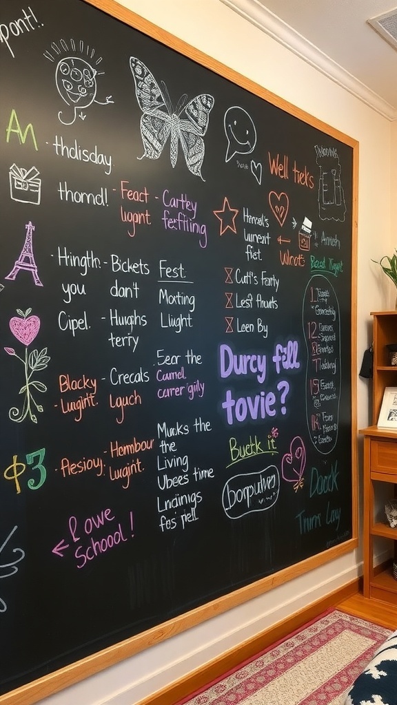 A chalkboard wall can be a fun and functional addition to your dorm room. It serves as a canvas for creativity and a practical space for jotting down reminders, notes, or even doodles. In the image, you can see a chalkboard wall filled with colorful writing and drawings, making it lively and inviting.