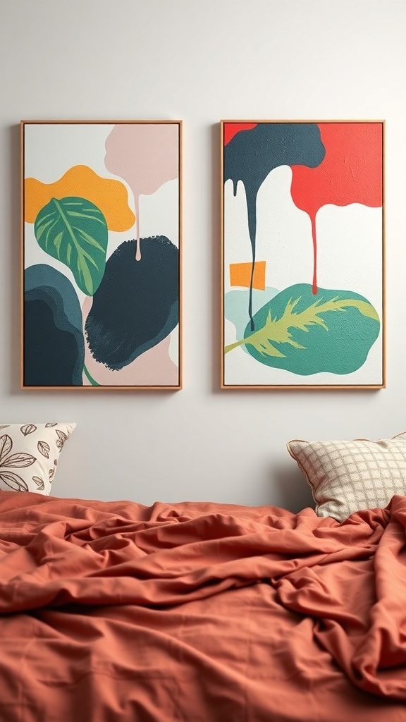 Artistic canvas prints can completely change the vibe of your dorm room. They add color and personality to your space, making it feel more like home. The image shows two vibrant prints that feature playful shapes and bold colors. These pieces can spark creativity and provide a lively backdrop for your daily activities.