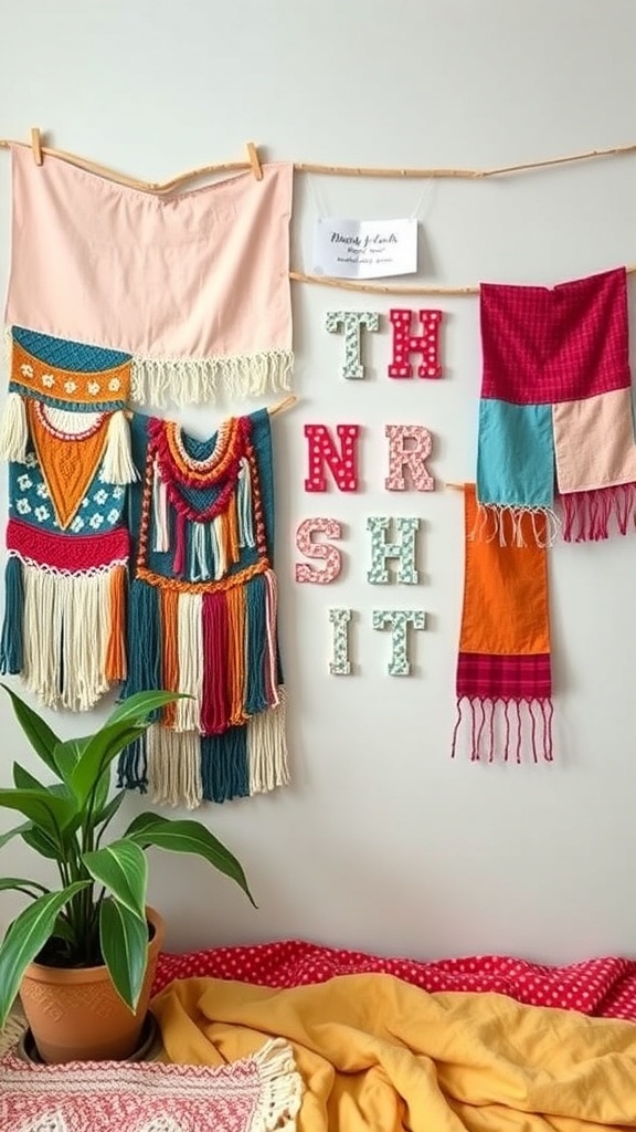 Fabric wall hangings are a fun and creative way to personalize your dorm room. They add color and texture to your walls, making the space feel more inviting. In the image, you can see a vibrant arrangement of fabric pieces, showcasing different patterns and textures.