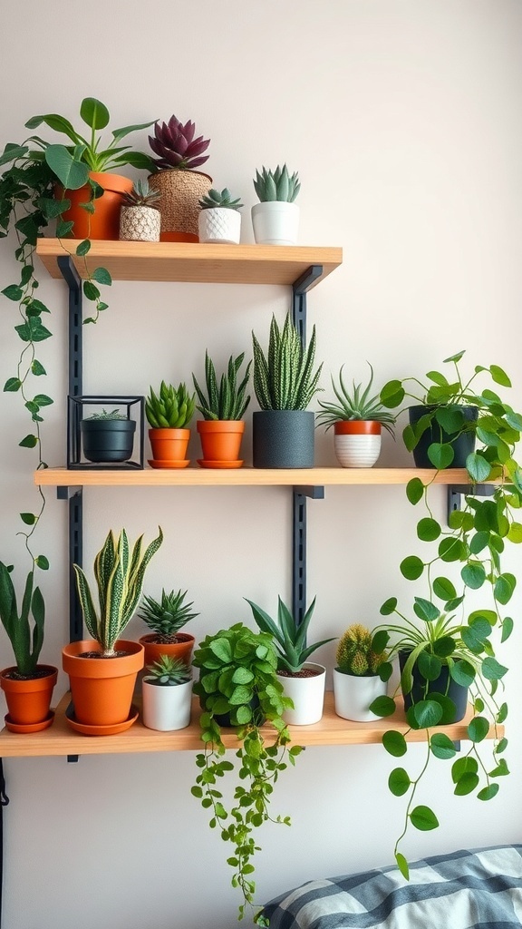 Having different types of plants, like succulents and trailing vines, creates visual interest. The green leaves contrast beautifully with the earthy tones of the pots. This setup not only looks good but also helps improve air quality, making your dorm a healthier place to live.