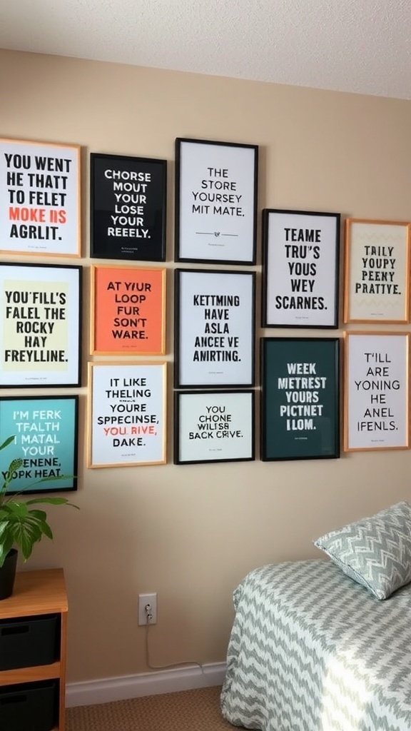 Inspirational quote posters are a fantastic way to add personality to your dorm room. They not only brighten up the walls but also serve as daily reminders to stay motivated. The image showcases a collection of framed quotes that create a vibrant and uplifting atmosphere.