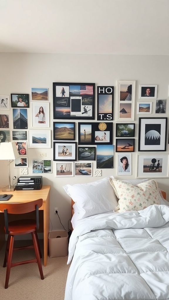 A gallery wall is a fantastic way to showcase your personal memories. The image captures a cozy dorm room featuring a wall filled with framed photos and art. Each frame tells a story, whether it’s a snapshot from a fun trip, a cherished moment with friends, or a favorite landscape. This collection creates a warm and inviting atmosphere.